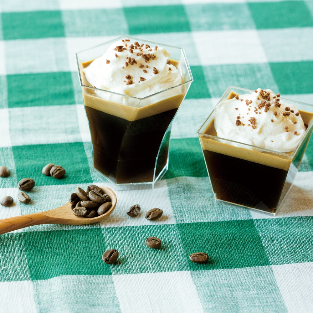 風味豊かなエスプレッソを使用した大人の味わい。コーヒーゼリーとクリーミーなゼリーの2層ハーモニーをお楽しみください。