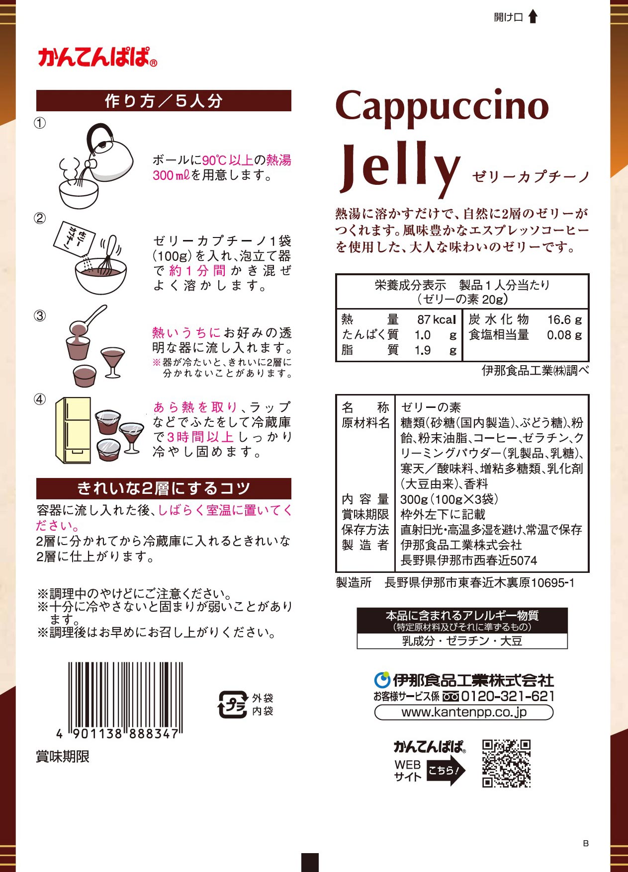糖類(砂糖(国内製造)、ぶどう糖)、粉飴、粉末油脂、コーヒー、ゼラチン、クリーミングパウダー(乳製品、乳糖)、寒天/酸味料、増粘多糖類、乳化剤(大豆由来)、香料