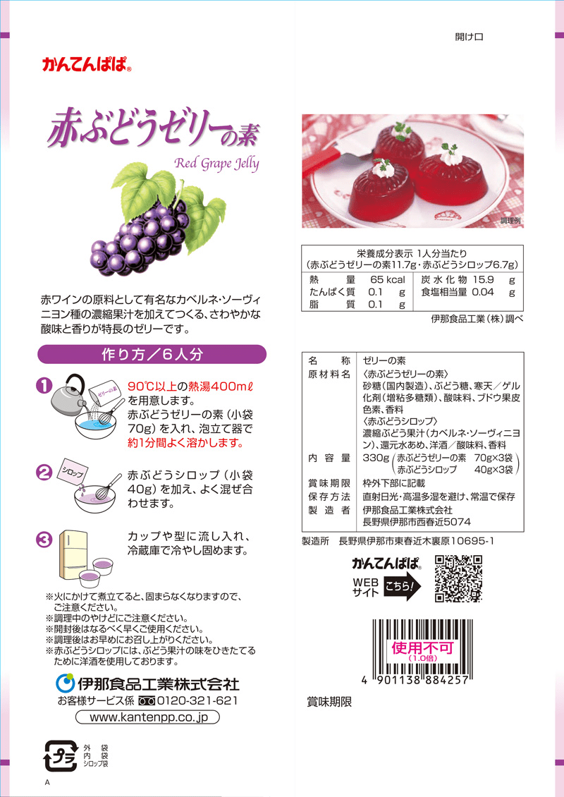 ①90℃以上の熱湯400mlを用意します。赤ぶどうゼリーの素(小袋80g)を入れ、約1分間よく溶かします。②赤ぶどうシロップ(小袋40g)を加え、よく混ぜ合わせます。