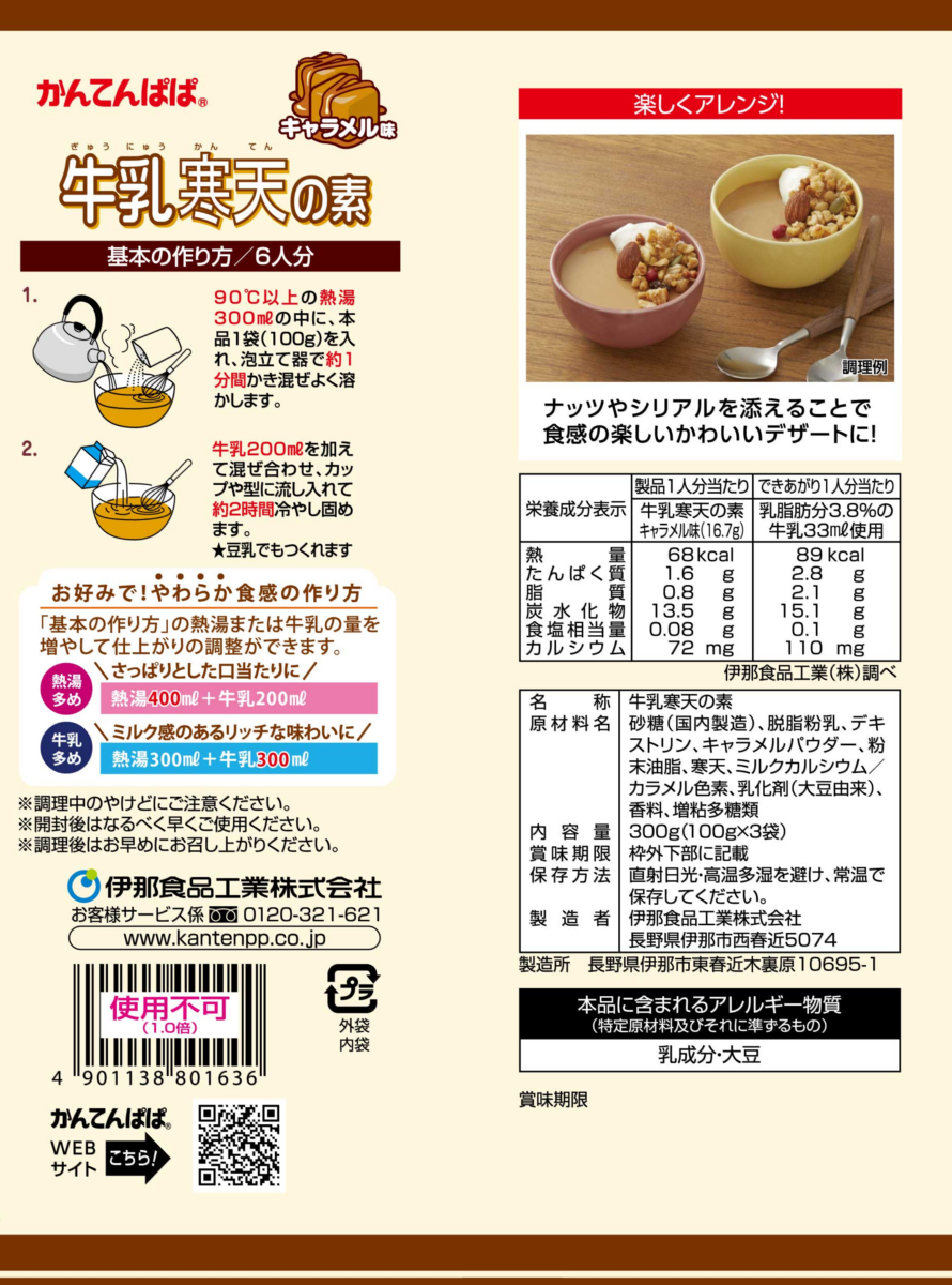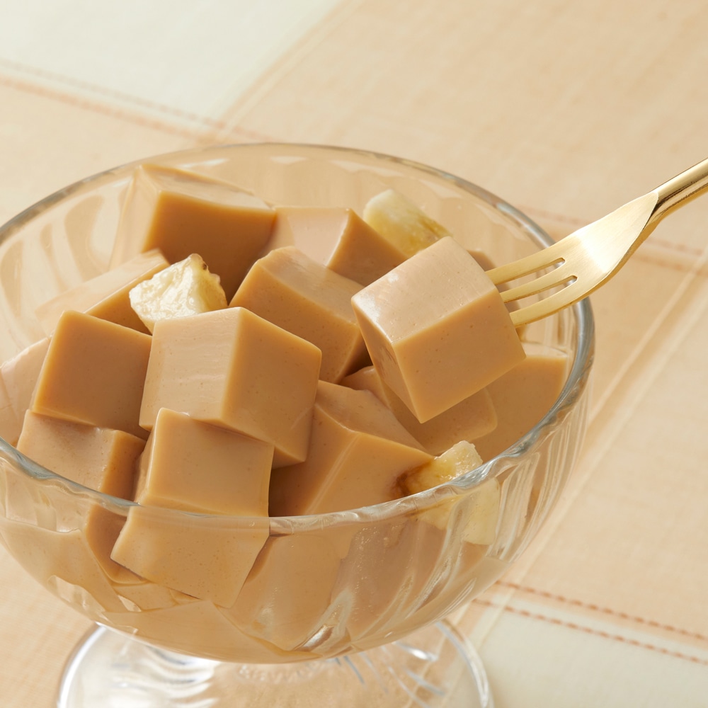 ①90℃以上の熱湯300mlの中に、本品1袋(100g)を入れ、泡立て器で約1分間かき混ぜよく溶かします。②牛乳200mlを加えて混ぜ合わせ、カップや型に流し入れて約2時間冷やし固めます。(豆乳でもつくれます)