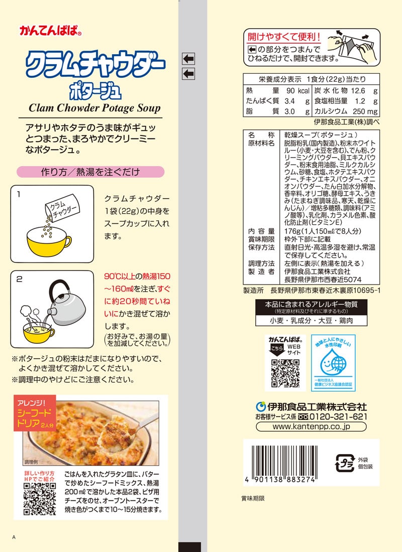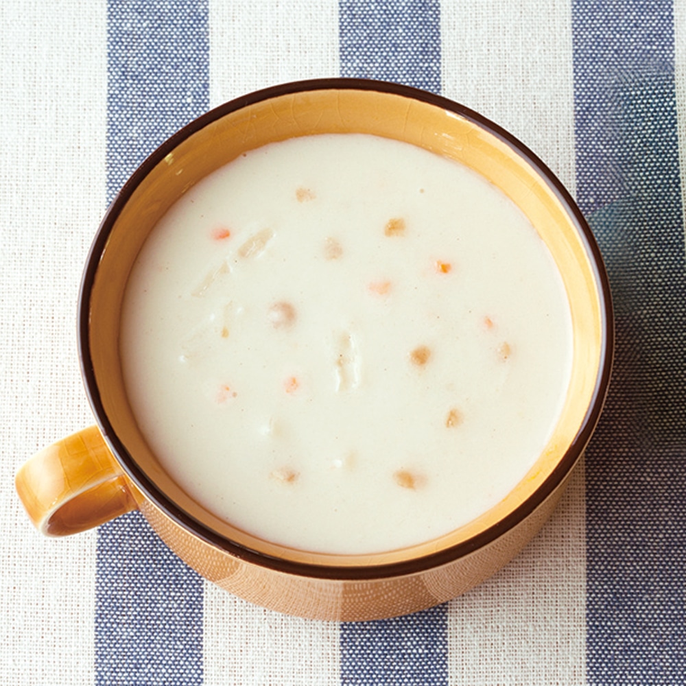 - 脱脂粉乳(国内製造)、粉末ホワイトルー(小麦・大豆を含む)、でん粉、クリーミングパウダー、貝エキスパウダー、粉末食用油脂、ミルクカルシウム、砂糖、食塩、ホタテエキスパウダー、チキンエキスパウダー、オニオンパウダー、たん白加水分解物、香辛料、オリゴ糖、酵母エキス、うきみ(たまねぎ調味品、寒天、乾燥にんじん)/増粘多糖類、調味料(アミノ酸等)、乳化剤、カラメル色素、酸化防止剤(ビタミンE)