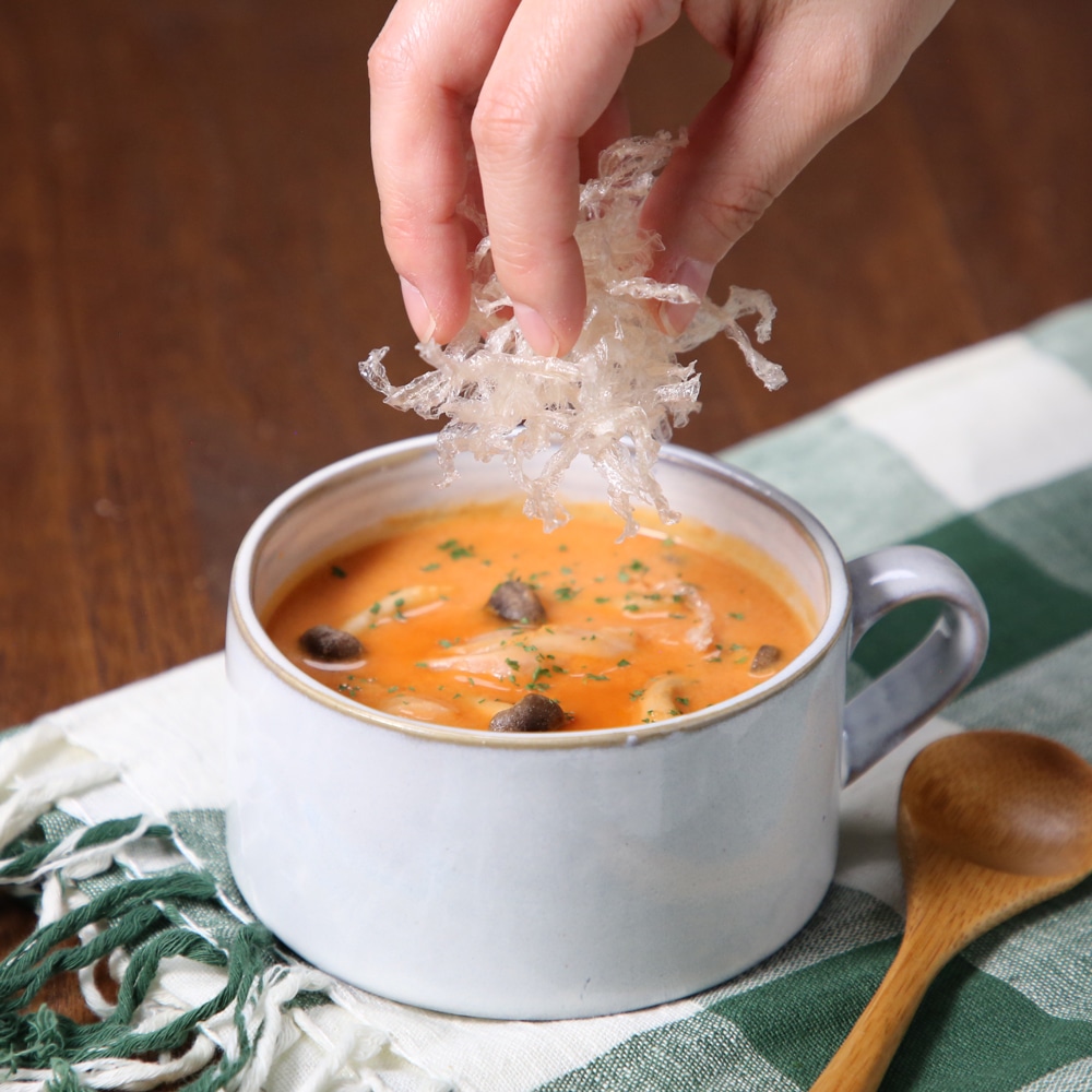 本品をスープやみそ汁の中へ直接入れ、よく混ぜてお召し上がり下さい。1人分はひとつまみ約2gが目安です。