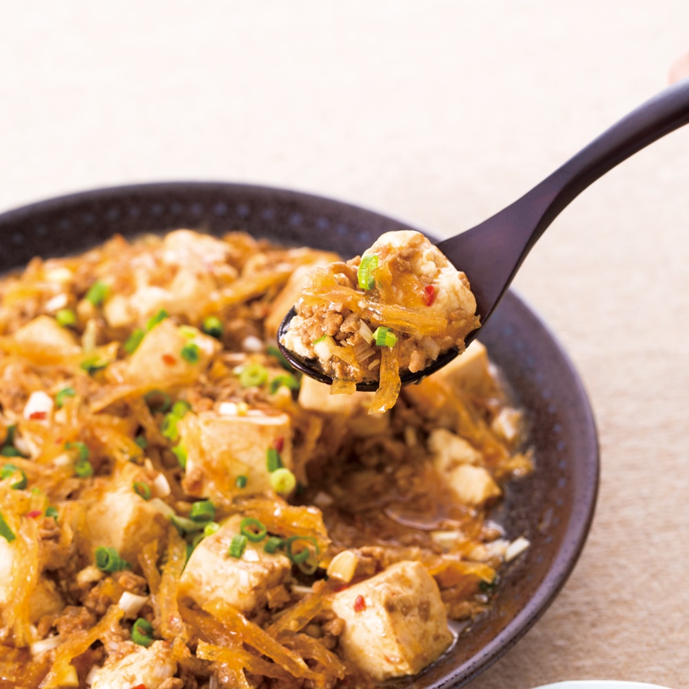 麻婆豆腐をつくり、水で戻したスープ用糸寒天を加えてひと混ぜします。 スープ用糸寒天を加えて手軽に食物繊維をプラス。
