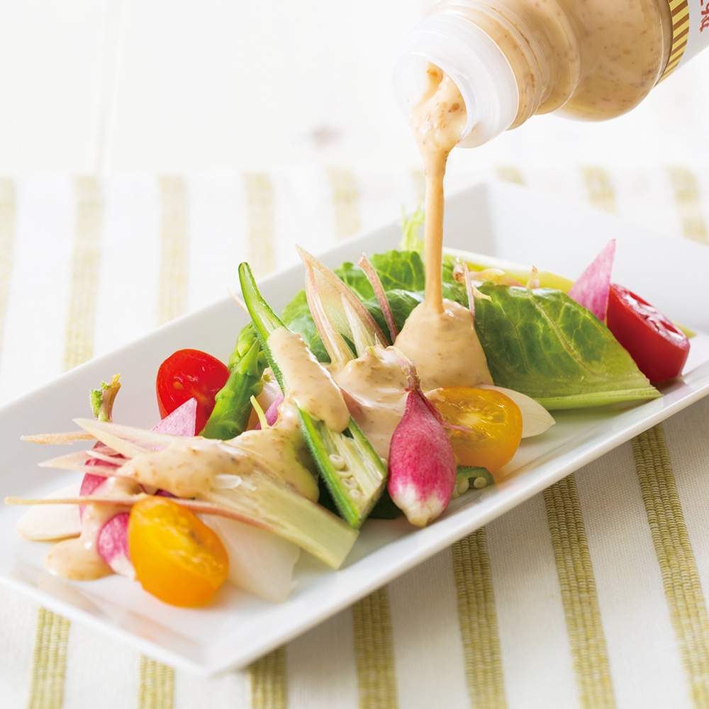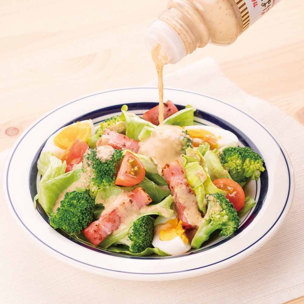 風味豊かなごまをたっぷり使った濃厚でコクのある味わい。とろりとしたドレッシングが具材によく絡んで、野菜をおいしく食べられると人気のドレッシングです。