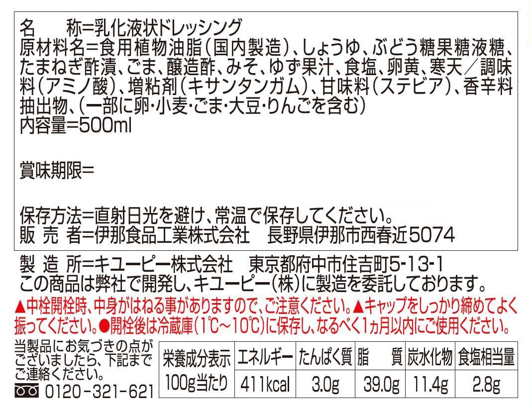食用植物油脂(国内製造)、しょうゆ、ぶどう糖果糖液糖、たまねぎ酢漬、ごま、醸造酢、みそ、ゆず果汁、食塩、卵黄、寒天/調味料(アミノ酸)、増粘剤(キサンタンガム)、甘味料(ステビア)、香辛料抽出物、(一部に卵・小麦・ごま・大豆・りんごを含む)