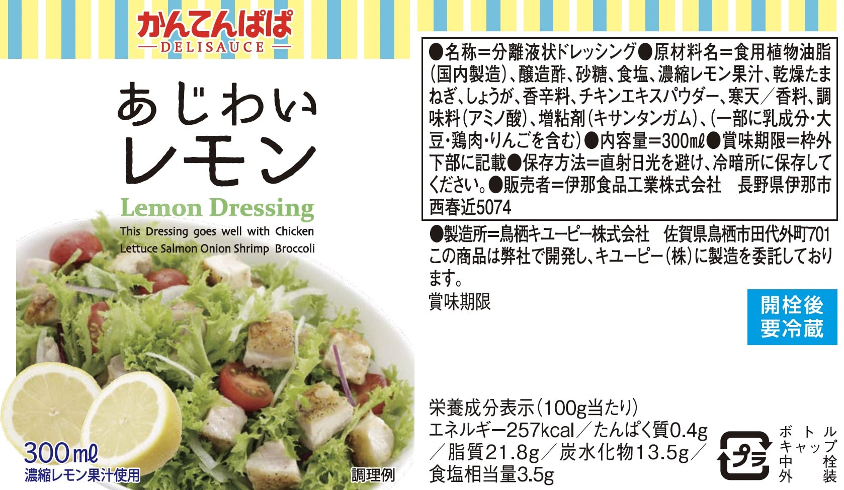 食用植物油脂(国内製造)、醸造酢、砂糖、食塩、濃縮レモン果汁、乾燥たまねぎ、しょうが、香辛料、チキンエキスパウダー、寒天/香料、調味料(アミノ酸)、増粘剤(キサンタンガム)、(一部に乳成分・大豆・鶏肉・りんごを含む)