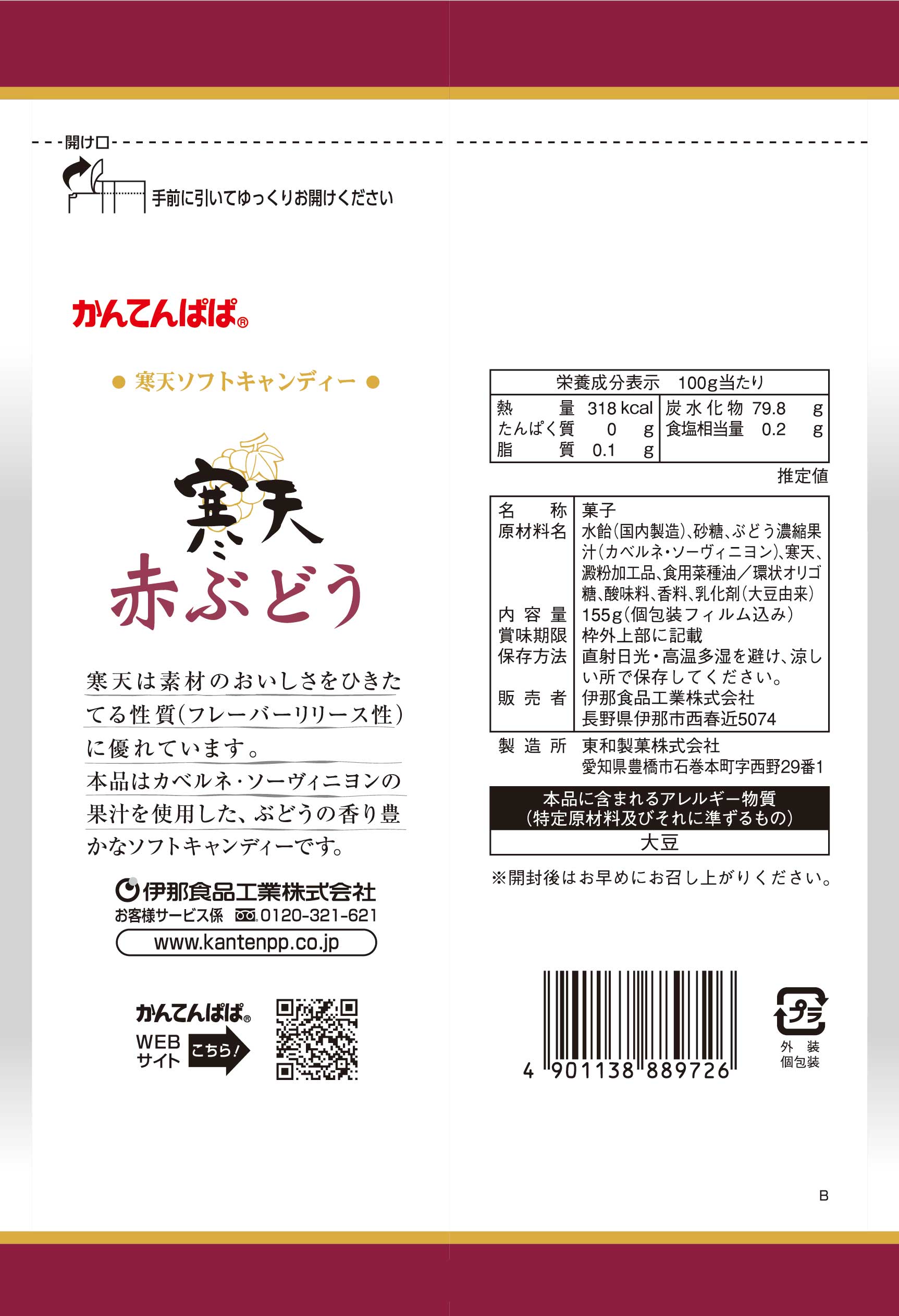 水飴(国内製造)、砂糖、ぶどう濃縮果汁(カベルネ・ソーヴィニヨン)、寒天、澱粉加工品、食用菜種油/環状オリゴ糖、酸味料、香料、乳化剤(大豆由来)