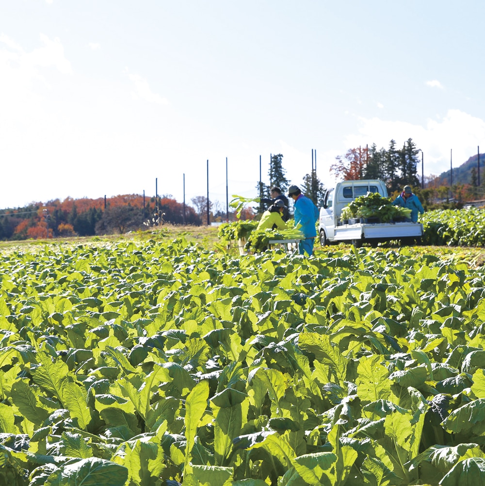 かんてんぱぱグループの社員総出で収穫した野沢菜を、南信州に伝わる製法「しょうゆ漬」で漬け込み、べっこう色になるまで時間をかけて発酵・熟成させました。