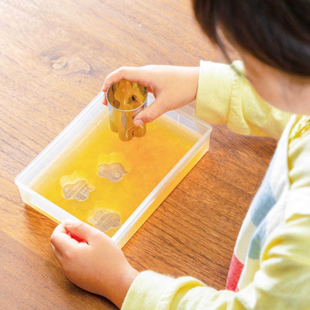 オレンジ味は、柑橘の酸味が控えめで食べやすく、さわやかな味です。 シンプルなゼリーなので、フルーツを入れたり、型抜きをしたり、アレンジを楽しめます。