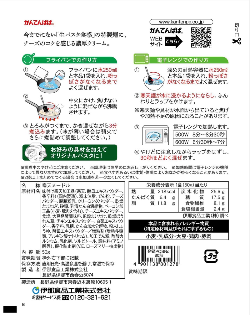 - 味付け寒天加工品(寒天、酵母エキスパウダー、香辛料)(国内製造)、粉末油脂、でん粉、チーズパウダー、脱脂粉乳、クリーミングパウダー、乾燥たまねぎ、砂糖、乳清たん白濃縮物、ベーコン加工品(小麦・豚肉を含む)、チーズエキスパウダー、食塩、大豆発酵調味料、乾燥まいたけ、乾燥ほうれん草、チキンエキスパウダー、白菜エキスパウダー、香辛料、乳糖、たん白加水分解物、粉末しようゆ、酵母エキスパウダー/増粘剤(増粘多糖類、アルギン酸ナトリウム)、加工でん粉、酢酸力ルシウム、乳化剤、ソルビトール、調味料(アミノ酸等)、酸化防止剤(V.E、ローズマリー抽出物)
