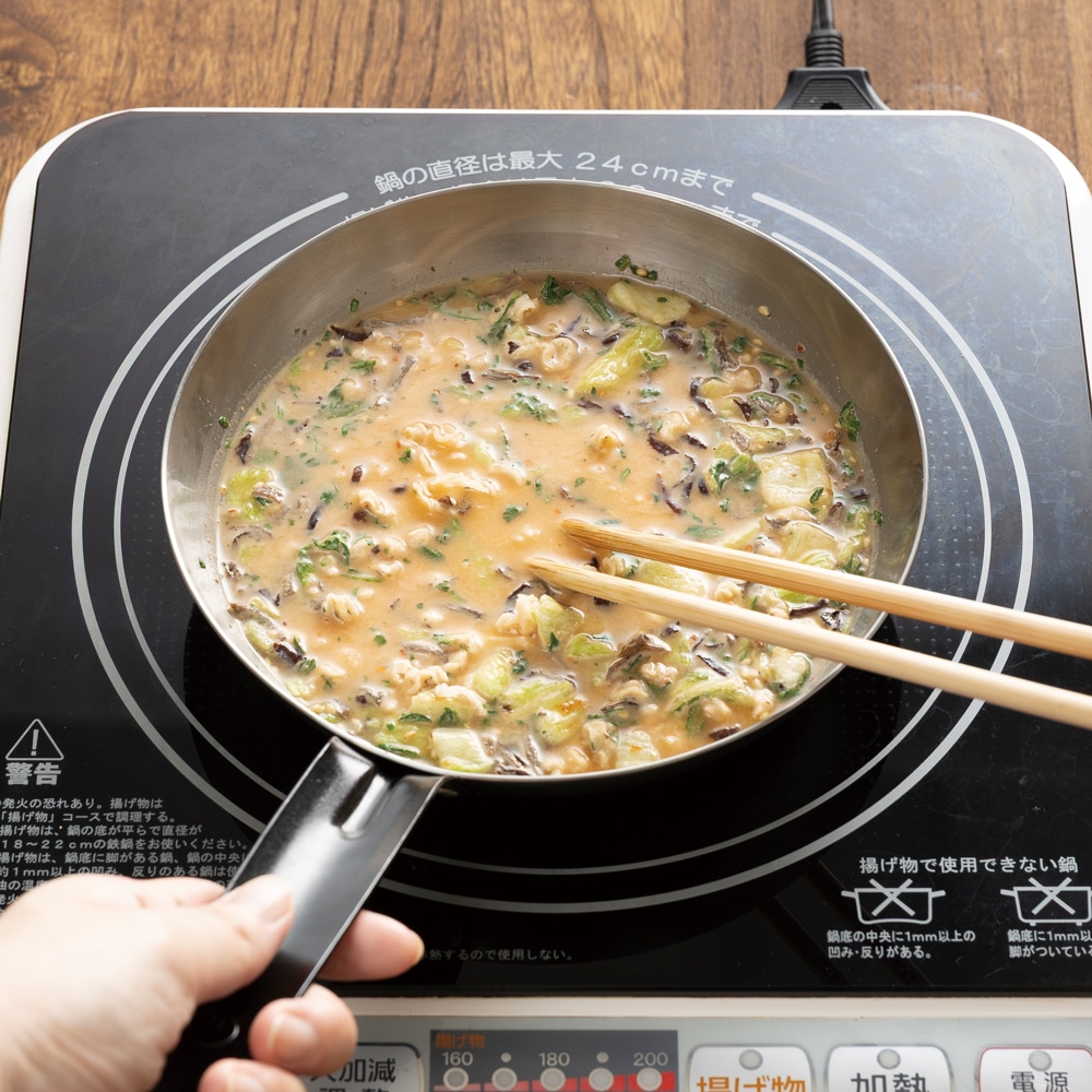 ③とろみがつくまで、かき混ぜながら3分煮込みます。(味が薄い場合は弱火でさらに煮詰めて調整してください。)