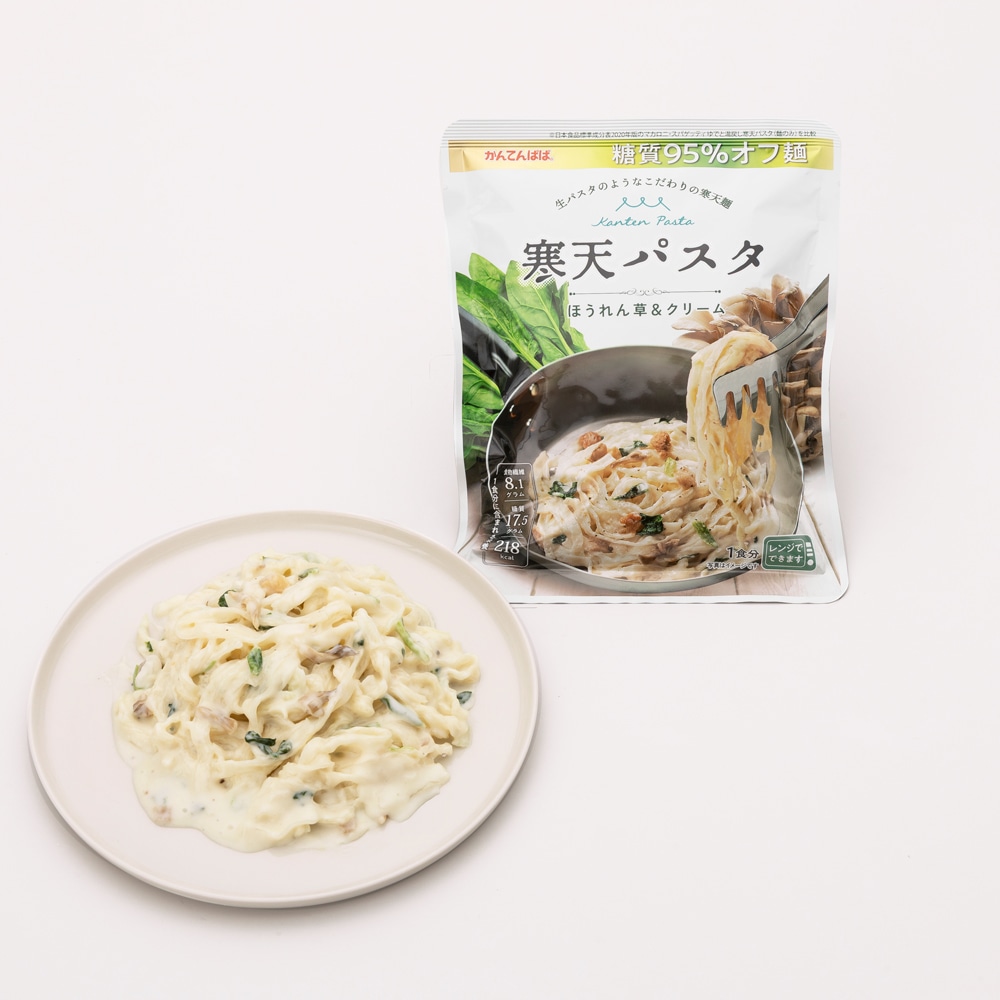 まるで生パスタのような食感の寒天麺。用意するのは水とフライパンだけで、電子レンジでも調理可能です♪