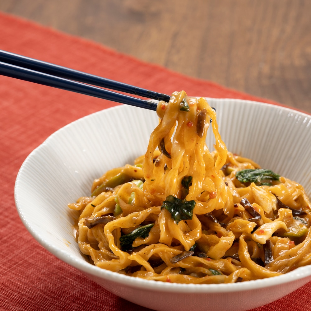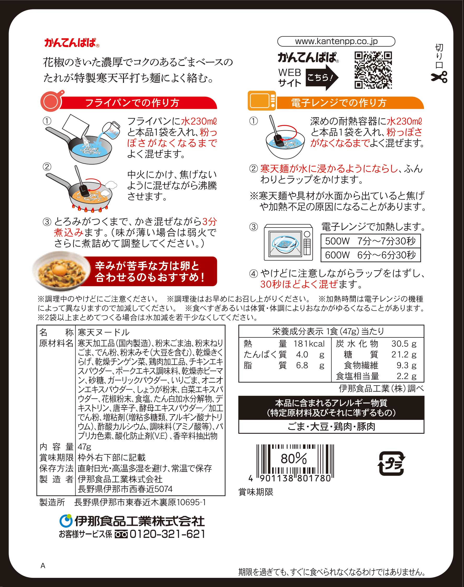 - 寒天加工品(国内製造)、粉末ごま油、粉末ねりごま、でん粉、粉末みそ(大豆を含む)、乾燥きくらげ、乾燥チンゲン菜、鶏肉加工品、チキンエキスパウダー、ポークエキス調味料、乾燥赤ピーマン、砂糖、ガーリックパウダー、いりごま、オニオンエキスパウダー、しょうが粉末、白菜エキスパウダー、花椒粉末、食塩、たん白加水分解物、デキストリン、唐辛子、酵母エキスパウダー/加工でん粉、増粘剤(増粘多糖類、アルギン酸ナトリウム)、酢酸カルシウム、調味料(アミノ酸等)、パプリカ色素、酸化防止剤(V.E)、香辛料抽出物