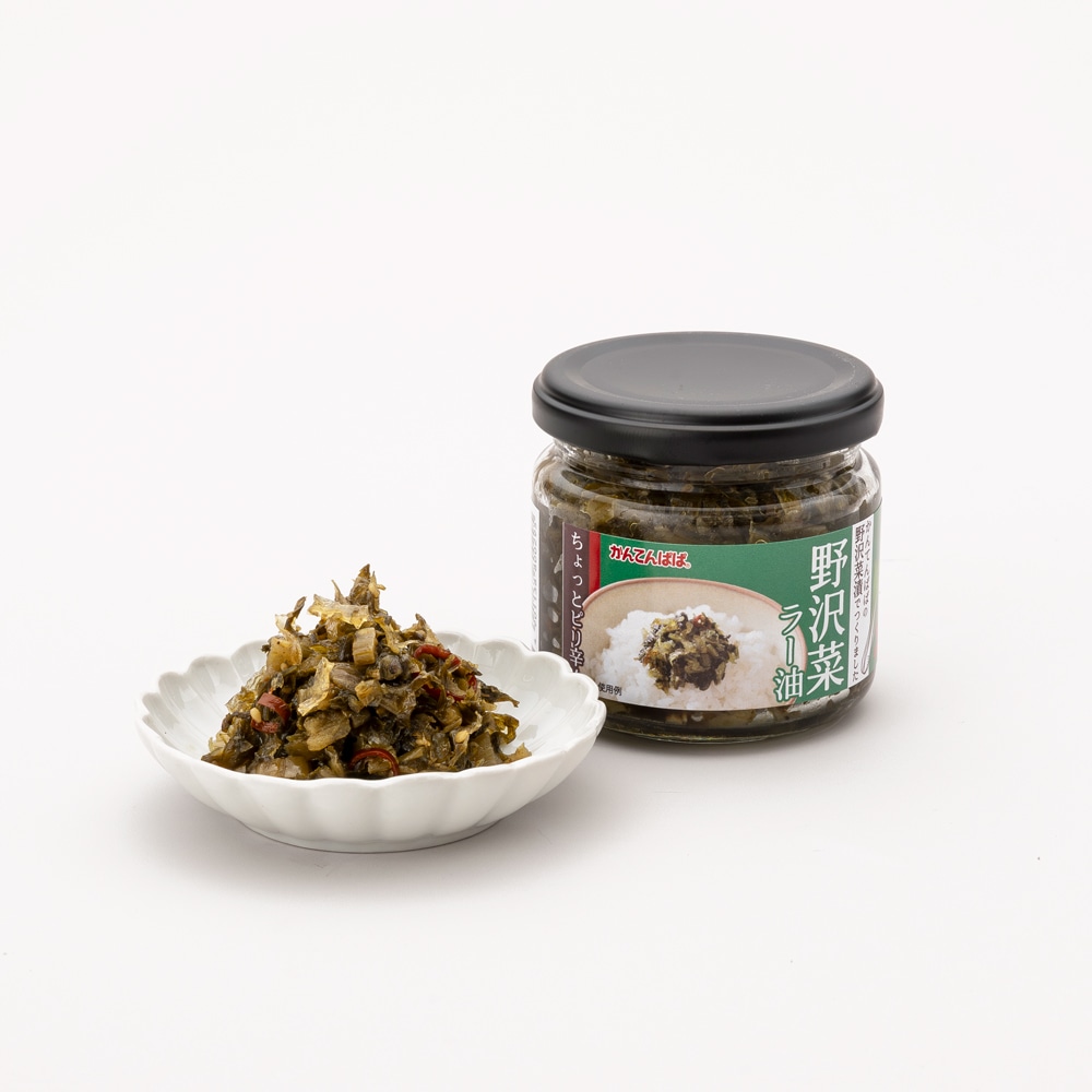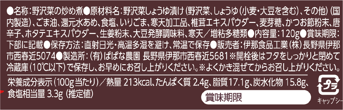 野沢菜しょうゆ漬け(野沢菜、しょうゆ(小麦・大豆を含む)、その他)(国内製造)、ごま油、還元水あめ、食塩、いりごま、寒天加工品、椎茸エキスパウダー、麦芽糖、かつお節粉末、唐辛子、ホタテエキスパウダー、生姜粉末、大豆発酵調味料、寒天/増粘多糖類